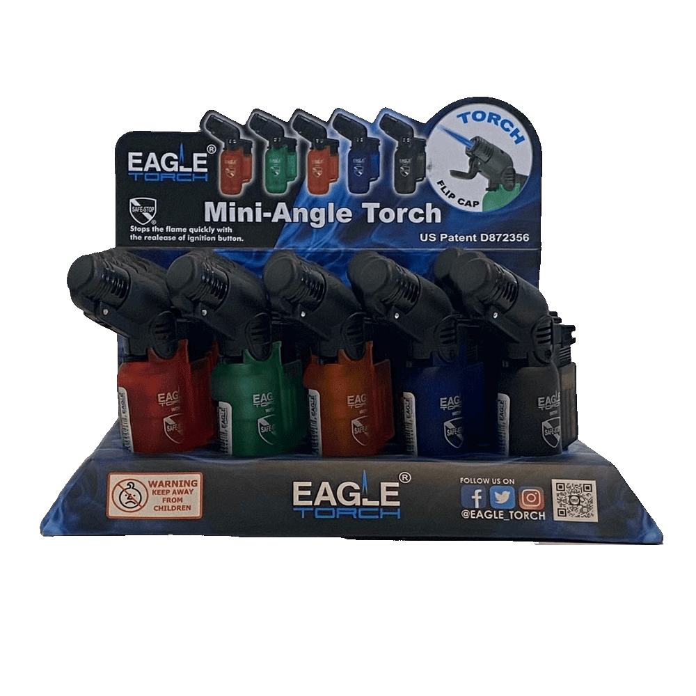 These Mini Angle Eagle Torch units deliver a powerful jet flame that is ideal for outdoor use, lighting cigars, pipes, or campfires, even in breezy conditions. The ergonomic body provides a comfortable grip, while the clear or colored fuel tank (depending on model) helps you see when it is time for a refill. This pack is perfect for shops, counters, or anyone who likes to keep multiple reliable torches on hand.